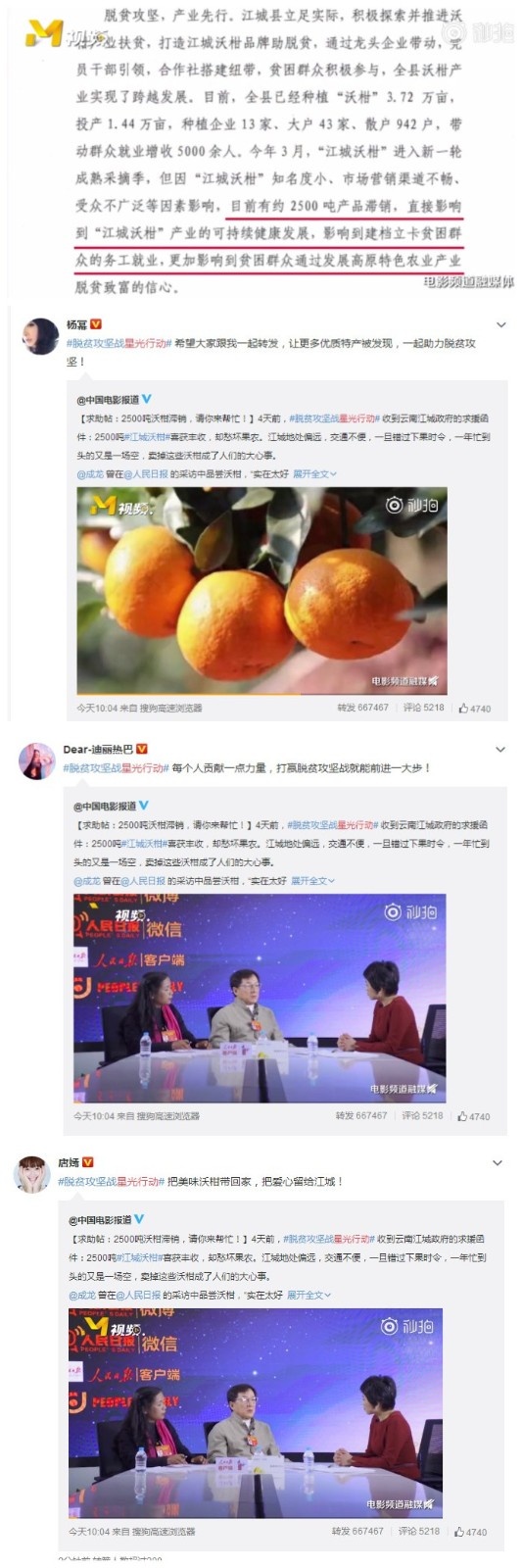 Dispatch of 1905 films net now, chinese film story releases appeal post: "2500 tons of fertile mandarin orange are slow-moving, ask you to help! " it is reported, 4 days ago, get Yunnan Jiangchen government recourse correspondence: Happy event of fertile mandarin orange of 2500 tons of Jiangchen reaps a bumper harvest, however anxious bad fruit grower. Jiangchen is located in out-of-the-way, traffic inconvenience, once miss next fruit season, a year of busy in the end is all in vain, sold these fertile mandarin orange to become the big worry of people. This is stuck after giving out, get be responsed actively of a lot of star, the numerous star such as Yang Mi, Zhang Yuqi, Li Yifeng, Chen He, Zheng Kai, Tang Yan, Dilireba active transmit is bought, the fruit grower that is Yunnan Jiangchen people dissolve an extremely urgency, also answer everybody to aid force to take off battle of deficient assault fortified positions together.