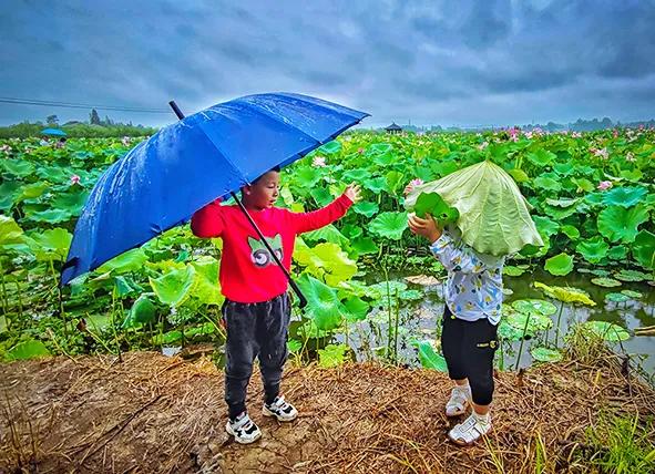 The commissioner comments on: Symmetrical style composition of a picture has the characteristic of echo of balance, photograph, two young associate, an umbrella a lotus leaf, my umbrella is better than your lotus leaf, my lotus leaf compares your umbrella cruel, there is change again in semmetry, extremely rich appeal.