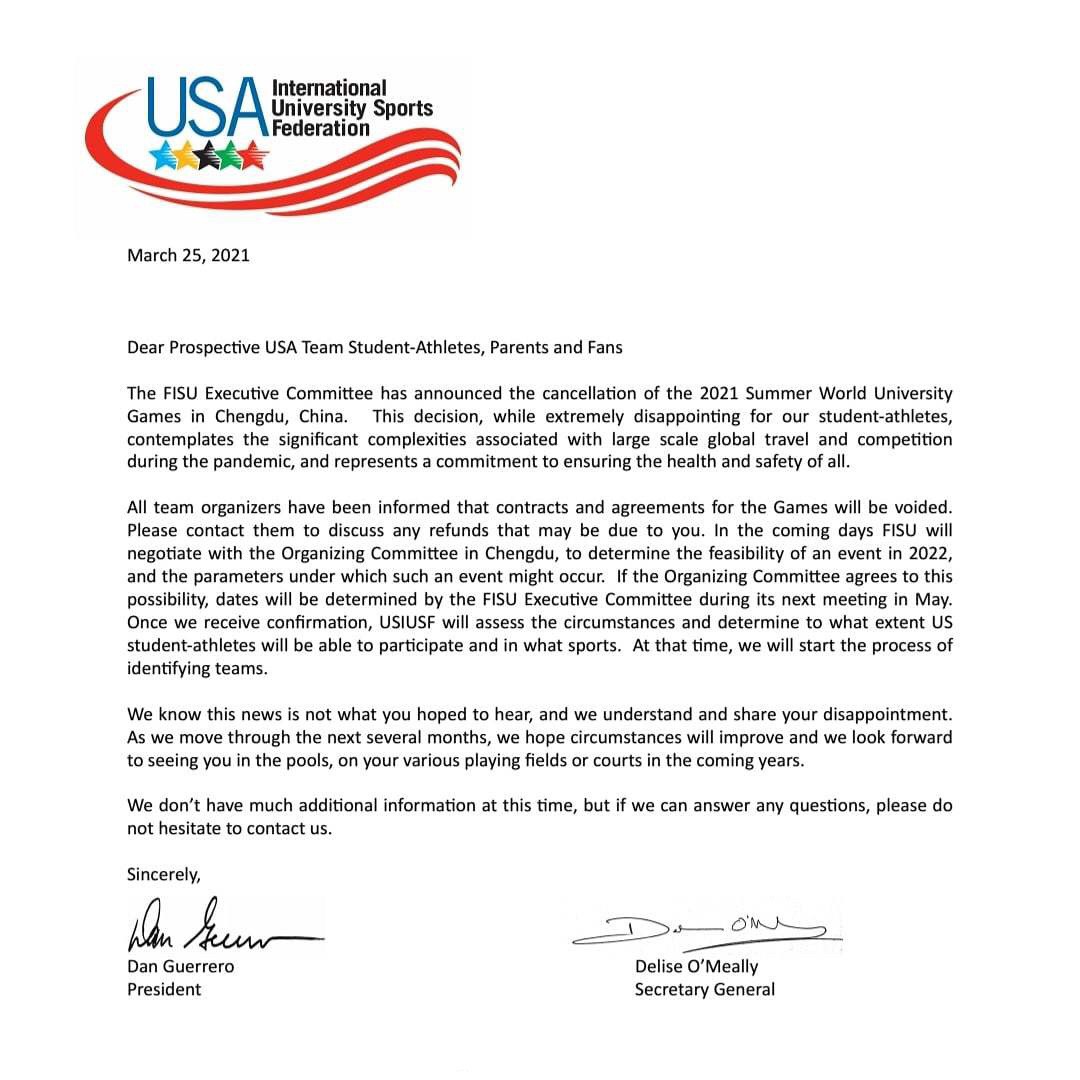 The file expresses, federation of sports of prospective international undergraduate will carry with Chengdu the organizing committee is communicated greatly, talk things over to reach match delay 2022. The regret of the student athlete that takes part in the match to original plan, parent and vermicelli made from bean starch was expressed at the same time in mail.